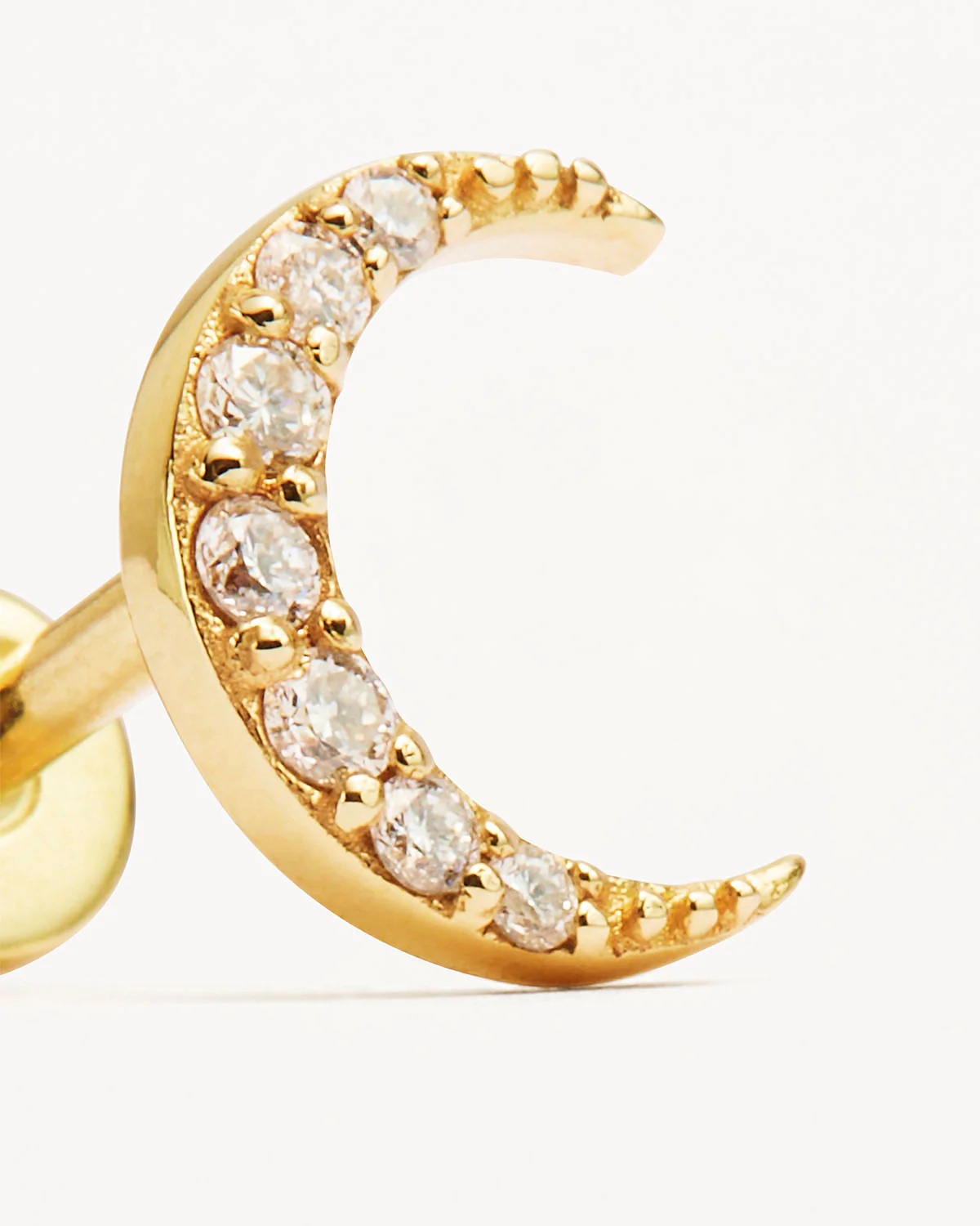 Appreciate the beauty of new beginnings with our 14k Gold Evening Sky Diamond Cartilage Earring. This internally threaded flatback earring features 7 diamonds that taper in size to complement the crescent-shaped moon. This flatback earring is perfect for styling the conch piercing.
