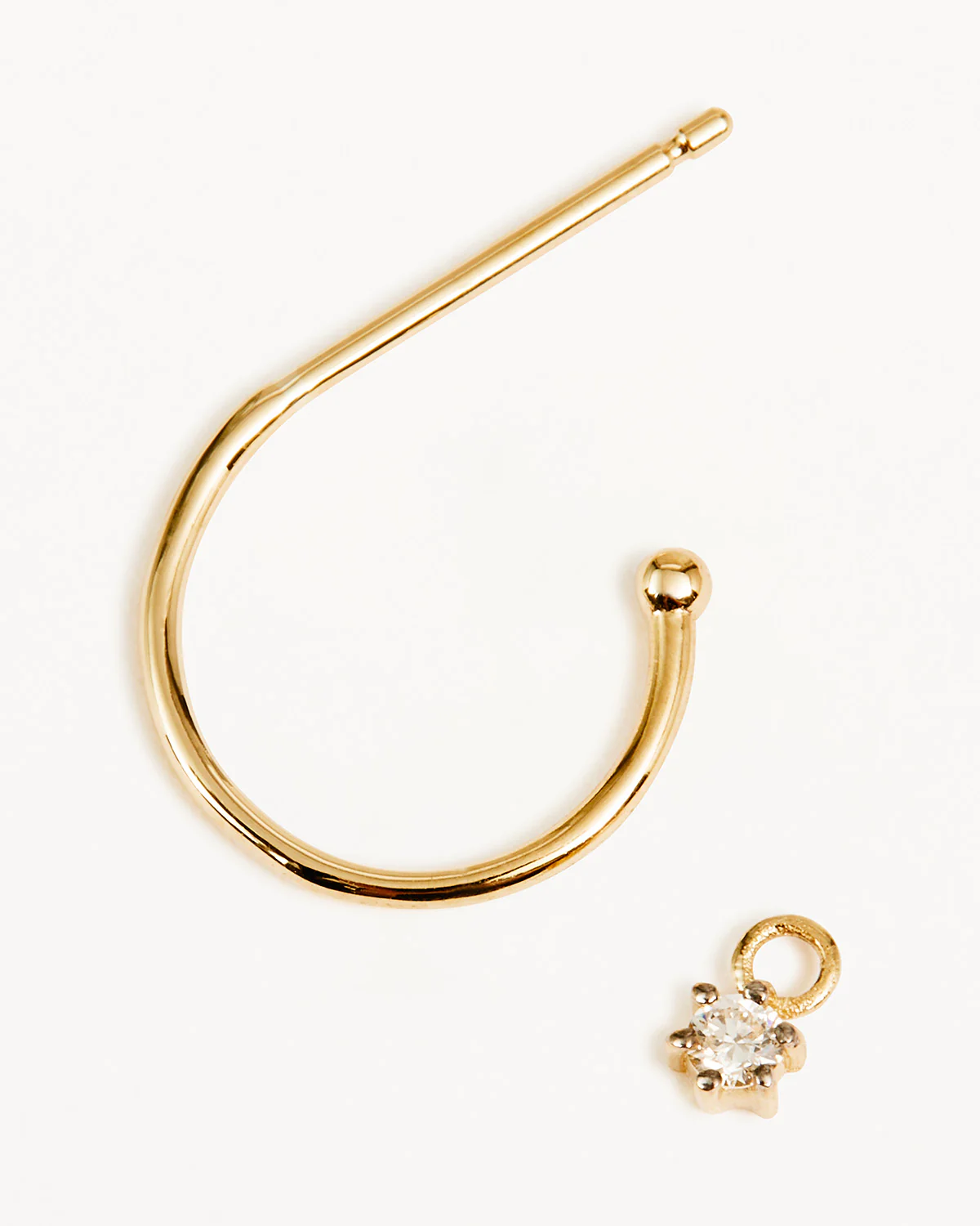 Inspired by the illuminating droplets of dew found on the sacred blossom's petals in the early morning light, our 14k Gold Sweet Droplet Diamond Hoop features a tiny sparkling white Diamond on a classic Gold hoop.