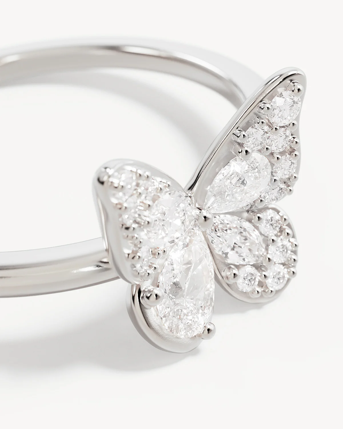 Delicate butterfly design set with round, marquise and pear cut cubic zirconias in a claw setting.